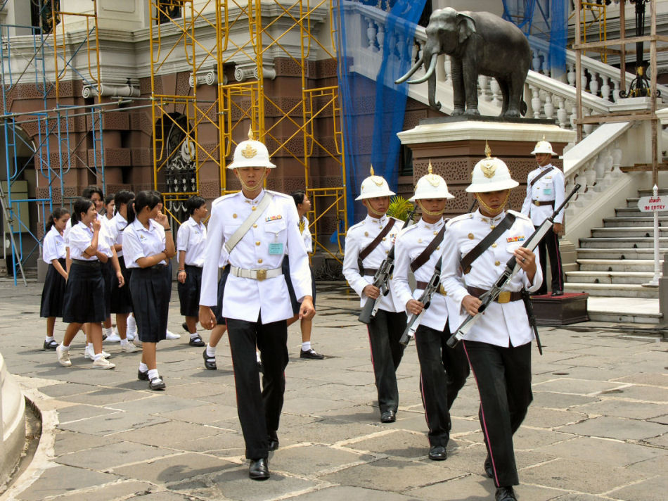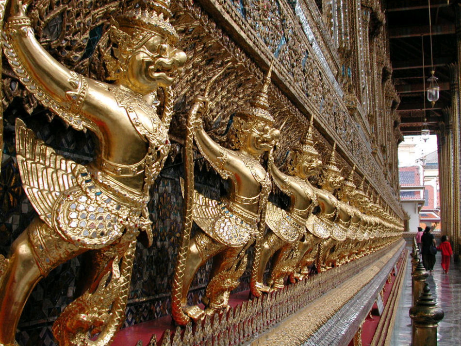 Het huidige Koninklijke paleis wordt feitelijk niet meer bewoond door de koning. Het is meer een soort tempelcomplex bezocht door immense menigten bezoekers. Zoals alles in Thailand is het buitengewoon kleurrijk. Ze hebben duizenden tempels, pagoden en andere heiligdommen in Thailand. Dagelijks worden er bijgebouwd. Zelf houden we in Nederland van wat meer ingetogenheid. Vaak zijn tempels wat kitscherig. Echter vooral de beelden rond de tempels in koninklijk paleis zijn uniek in hun uitdrukkingskracht. Geen twee beelden zijn hetzelfde. Steen, email, goud en zilver wisselen elkaar af. Prachtig gestileerde draken op trapleuningen zie je hier en elders.