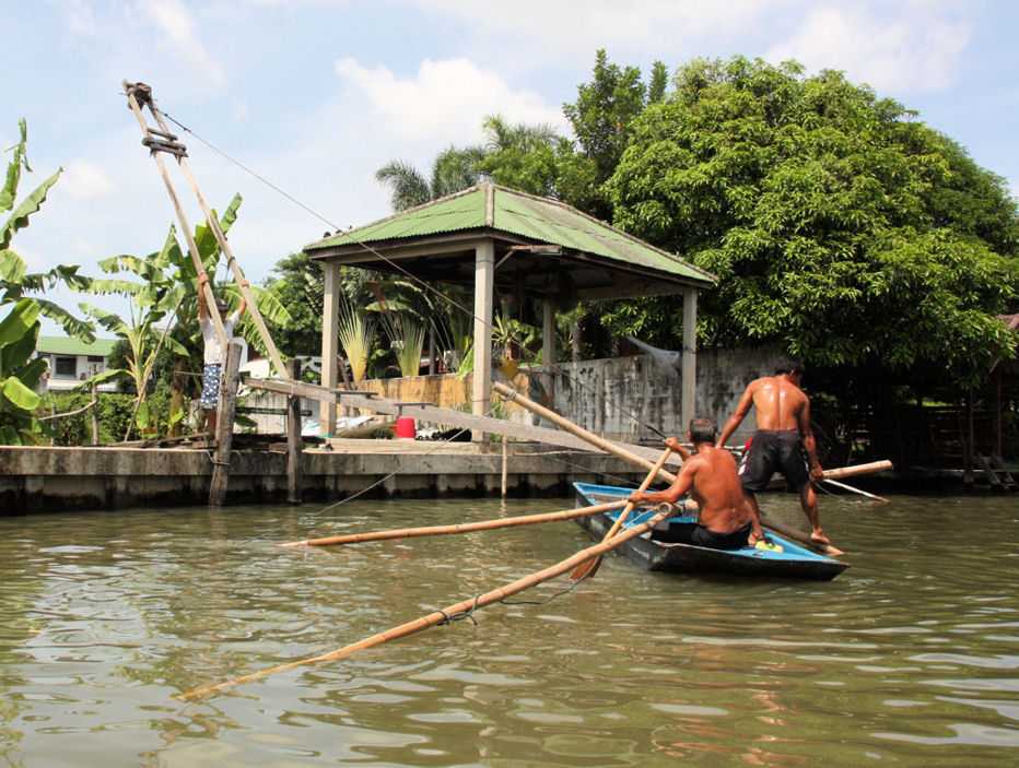 Samen met Marc deden we in 2012 ook een boottocht door de Wongs. We hadden nu een privé James Bond boot. Het was niet eenvoudig voor Wim om aan boord te komen zonder een ordentelijke steiger. Met gezamenlijke krachten werd hij de boot in en uit gehesen. Onderweg zagen we lokale vissers aan het werk met een geďmproviseerde hijsinstallatie. De Wongs hebben enorm te lijden gehad van de overstromingen in het voorjaar van 2012. Een groot aantal huizen langs het water zijn verlaten of staan te koop. Overal zag je vuilnis hangen aan de draden. Kennelijk heeft het water op sommige plaatsen zo hoog gestaan. De huizen zelf zijn maandenlang feitelijk onbewoonbaar geweest. Het zijn leuke woningen, maar dan moet je er wel kunnen wonen...
