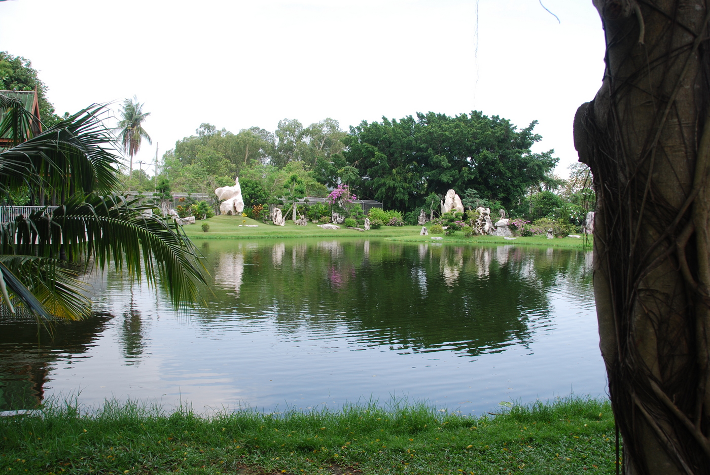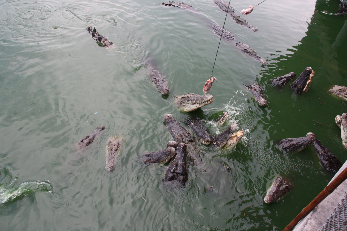 Deze pretparken zijn vooral bedoeld voor de lokale bevolking. In Jomtien is 90% van de toeristen afkomstig uit Thailand zelf. De Europeanen vormen maar een zielige minderheid. Feitelijk hebben we alle door Mathieu Korporaal aangeboden excursies gedaan. De damjeugd vond het voeren van krokodillen wel een aardige bezigheid. Je kon voor een paar bath een kip aan touwtje laten vastmaken en aldus krokodillen gaan hengelen. De kunst was om de kip net op tijd omhoog te halen voordat de bek van een krokodil zich om de lekkernij kon sluiten.